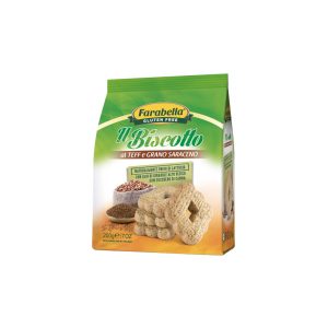 IngredientesFécula de batata, farinha de teff (17%), açúcar mascavado (15,5%), óleo de girassol alto oleico (14%), farinha de milho, farinha de arroz, farinha de trigo-sarraceno (8%), xarope de glicose, emulsionante: lecitina de girassol, sal, agentes de fermentação: pirofosfato ácido de sódio, bicarbonato de sódio, bicarbonato de amónio; aromas naturais, espessante: goma xantana. Pode conter vestígios de SÉSAMO, MOSTARDA e FRUTOS DE CASCA RIJA. Biscoito sem glúten, especialmente formulado para pessoas com intolerância ao glúten.